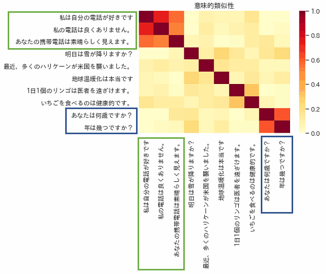 次の図は意味的類似性。わかりやすいように青色、緑色で囲んでいます。1.0に近いほど類似度が高い。