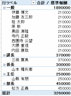 今度は「社員氏名」の上で右クリックをして「レポートフィルターに追加」を押します。すると役職毎に標準報酬が合計されました。