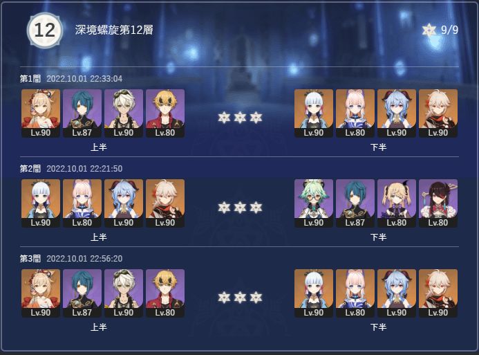 もちろん、「通し」で星9は無理なので構成を変更してクリアしています。プレイ時間で言うと、螺旋9-12層の全てを含めて1-2時間程度。