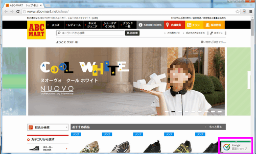 Google認定ショップは商品の到着予定や購入補償が可能です。このプロラムは購入者側は無料です。Google認定ショップの例としてABC-MARTにアクセスするとブラウザのページ右下にGoogle認定ショップが表示されます。