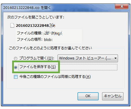 Excelファイルを読み込むとダイアログが表示されます。「ファイルを保存する」を選択して「OK」ボタンを押します。