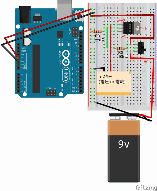 スライドスイッチを5V側にするとJFETがオンになります。9V側はJFETがオフとなります。