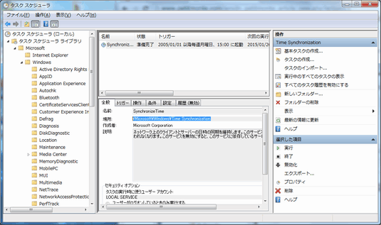 次に左メニューの「タスクスケジューラーライブイラリ」「Microsoft」「Windows」「Time Synchronization」を選択します。